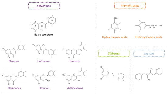 Chemically, polyphenols are characterized by a structure comprising one or several aromatic rings with at least one hydroxyl (OH) group able to neutralize a free electron while remaining stable. This phenolic structure gives them an antioxidant property. Rice-Evans et al. [128] showed a relationship between the structure of polyphenols and their antioxidant capacity. In particular, the polyphenols carrying an aromatic nucleus with two OH groups (catechol group) may exert stronger antioxidant effects than those with only one OH group. Currently, nearly 8000 polyphenols have been identified and classified into major chemical families according to the structure of their carbon skeleton and the number of phenolic rings (Figure 3). There are the phenolic acids, comprising hydroxybenzoic acids (derivatives of benzoic acid) and hydroxycinnamic acids (derivatives of cinnamic acid); the flavonoids that gather more than 5000 molecules, which share a common structure formed by two aromatic rings bound together by three carbon atoms forming an oxygenated heterocycle subdivided into different subclasses called flavones, isoflavones, flavonols, flavanones, flavanols (monomers, proanthocyanidin polymers) and anthocyanins; the stilbenes, with two phenyl groups joined together by a methylene bridge; and the lignans, with two phenylpropane units [129].