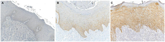 Microscopic images of TLR4 staining in representative lesions studied. (A), Normal oral mucosa. (B), Non-lichenoid epithelium surrounding OSCC (NLE-OSCC). (C), Lichenoid epithelium surrounding OSCC (LE-OSCC).