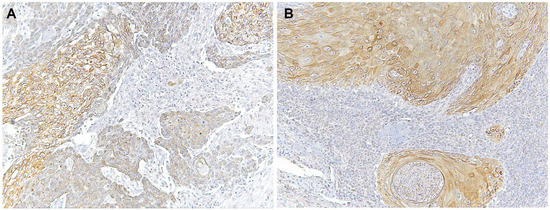 Immunotherapy has become a valuable treatment option against OSCC. Inhibition of the pathway between the programmed death 1 receptor (PD-1) and the programmed death ligand (PD-L1) decreases tumor growth, improving survival. However, such therapy appears to benefit only a subset of patients [34,35,36]. Therefore, the definition of OSCC originating from a lesion with phlogistic infiltrate, such as those originating from OLL, is very important in order to define subgroups, which will ensure a high number of TLR4-positive cells. TLR4 has been shown to exert immunosuppressive properties in different types of cancer [37,38]. Higher levels of TLR4 have already been correlated with high PD-L1 in non-small cell lung cancer [39], melanoma [40], and T-cell lymphomas [41]. The experimental inhibition of TLR4 was able to decrease PD-L1 expression on macrophages and dendritic cells co-cultured with OSCC cells [42]. Therefore, TLR4 level analysis may be a promising biomarker to define patients suitable for immune-targeted therapy.