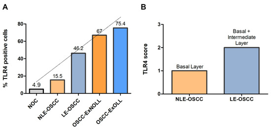 (A), Mean percentage of TLR4-positive cells among the investigated lesions. (B), TLR4 score according to the epithelial layer in NLE-OSCC and LE-OSCC.