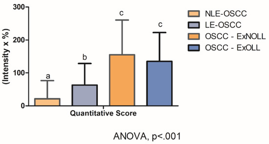 Statistical comparison among lesions regarding TLR4 staining quantitative score was statistically different (ANOVA, p < 0.001). Post-hoc analysis detected differences among the LE-OSCC group and the NLE-OSCC group (p = 0.007).