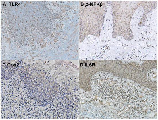 Microscopic images of inflammatory biomarkers in the surrounding epithelium of OSCC in representative lesions studied. (A), TLR4 staining. (B), p-NFKβ staining. (C), Cox2 staining. (D), IL6R staining.