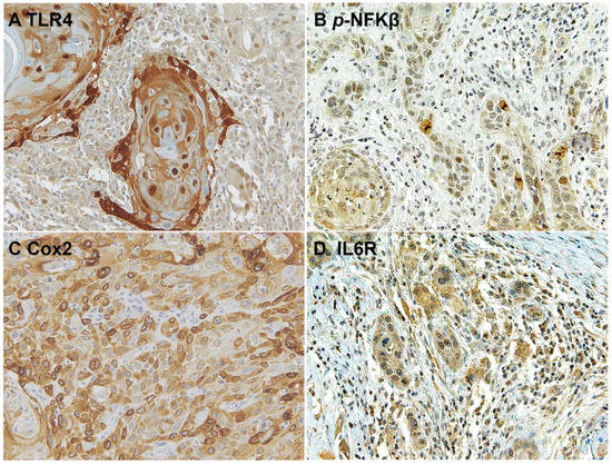 The downstream activation of the NFKβ pathway was detected by immunostaining of phospho-NFKβ in OSCC cells and in the surrounding non-tumoral epithelium of OSCC (Figure 5 and Figure 6). Cyclooxygenase-2 (Cox2) is also promoted by TLR4 signaling, and it was revealed that its expression was low in the surrounding non-tumoral epithelium of OSCC. However, it reached high levels in OSCC tumor cells. Interleukin 6 receptor staining, on the other hand, is abundant both in the non-tumoral epithelium surrounding OSCC and in tumor cells (Figure 5 and Figure 6).