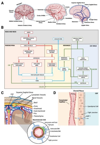 (A)—Coronal cross-section of brain arterial supply (left), sagittal cross-section of brain arterial supply (middle), sagittal view of brain venous system (right). (B)—2D roadmap of blood and fluid circulation within the brain. The Aorta gives rise to the vertebral and carotid arteries, where at the circle of Willis, smaller parenchymal (anterior, middle and posterior cerebral arteries) and meningeal arteries branch off to supply different regions of the brain. Parenchymal arteries branch into arterioles and further into capillaries, all of which display blood–brain barrier (BBB) phenotypes. Capillaries coalesce into post capillary venules, which go on to form larger veins. Veins in the brain drain into the dural sinuses situated in the meninges, where molecules are sampled by the meningeal lymphatics before draining into the jugular veins. Importantly, blood vessels within the Dura are fenestrated, and thus lack the abundance of tight junctions typical of endothelial cells of the BBB. The cerebrospinal fluid (CSF) fluid flow, also referred to as the glymphatic system, begins with the production of CSF from fenestrated capillaries (no BBB) of the choroid plexus into the ventricles. CSF flows from the ventricles to the sub-arachnoid spaces, and further into Virchow–Robin and perivascular spaces which form between the basement membrane layers of endothelium and surrounding astrocytes. Virchow–Robin spaces are sites of fluid exchange between the interstitial fluid (ISF) of the parenchyma and the CSF space. The nasal lymphatic system receives drainage from the CSF space, and together with the meningeal lymphatics, drains into the cervical lymph nodes. Red arrows indicate arterial blood flow, blue indicates venous blood flow, green arrows indicate “glymphatic flow” which includes lymphatic fluid, CSF, and ISF. (C)—Coronal view of the surface of the cortex. The three meningeal layers are located between the parenchyma and skull, with the most superficial layer being the dura mater, followed by the arachnoid mater, sub-arachnoid space and finally, the pia mater. The dura mater contains a recently discovered network of lymphatic vessels and the sub-arachnoid space is host to a complex network of veins and arteries at the cortical–meningeal surface. The Neurovascular unit is comprised of select cells creating a tightly regulated system of molecular transport between the blood and the parenchyma (BBB). Endothelial cells are adhered to each other via tight junctions and are surrounded by endothelial basement membrane (BM). Pericytes and astrocytic foot processes further encapsulate the endothelial cells, anchored through an astrocytic basement membrane. (D)—Fluid flow within the choroid plexus. Ependymal cells of the choroid plexus create a blood–CSF barrier due to the presence of tight junctions. Passage of fluid extravasated from the fenestrated capillaries within the choroid plexus into the CSF space is regulated via transport through aquaporins such as AQP1.