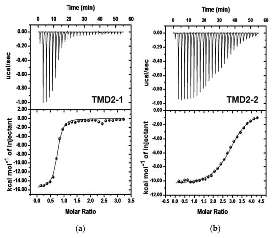 ITC profiles of (a) 50 μM peptides TMD2-1 and (b) TMD2-2 in 10 mM SDS micelles at pH 6 titrated with AgNO3. Figure adapted with permission from reference [59]. Copyright 2015 American Chemical Society.