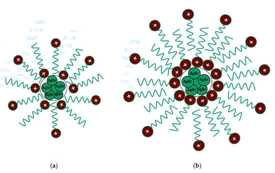 Schematic representation for (a) surfactant monolayer-protected AgBr nanoparticles and (b) AgBr nanoparticles stabilized by CTA+ bilayer. Figure adapted with permission from reference [62]. Copyright 2012 American Chemical Society.