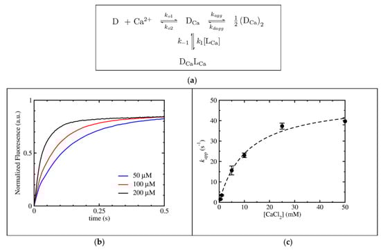 The presence of physiological metal ions may play an important role in modulating the efficacy of bio-active compounds. A system that was the object of intense study is daptomycin/Ca2+. Daptomycin is a cyclic polypeptide that has been in clinical use since 2003 to treat severe infections by Gram-positive drug-resistant bacteria. It was found that the activity of this important antibiotic depends critically on the presence of calcium ions. Recent work showed that the Ca2+-daptomycin complex interacts specifically with cell envelope precursors in the presence of an anionic phospholipid, forming a tripartite complex and explaining the specificity of daptomycin for bacterial cells [69]. Ca2+ is necessary for daptomycin-binding to the lipid membrane, mimicking cell walls that perturb the latter to a significant extent, causing the formation of domains and major reorganization essential to the antibiotic efficacy [70]. In a detailed kinetic study, the fluorescence resonance energy transfer (FRET) between the intrinsic Kyn residue of daptomycin and a fluorescent tag incorporated in the lipid membrane was used to monitor peptide-binding and dissociation from the vesicle-mimicking cell walls [71]. The kinetic model used to fit the data is shown in Figure 4a. Here, D is the daptomycin monomer, DCa is Ca2+-bound daptomycin, (DCa)2 is a Ca2+-bound daptomycin dimer, DCaLCa is the daptomycin monomer bound to a Ca2+-complexed lipid and LCa is the concentration of Ca2+-complexed lipid. The detailed kinetic study (using a stopped-flow technique with fluorescence detection) over different experimental conditions and reactant contents enabled the mechanistic (both equilibrium and kinetic) aspects of this complex system to be determined. On the whole, these experiments were able to describe the early events that occur in the binding of daptomycin to lipid bilayers and revealed the high affinity for the Ca2+-complexed lipid.