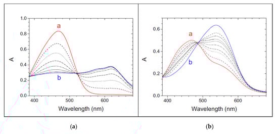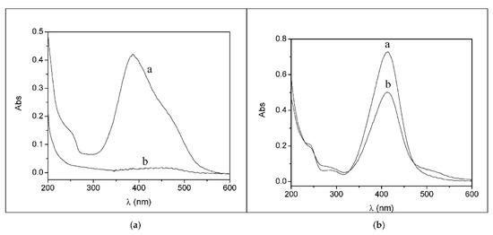 Ultrafiltration experiments on the PAR/SDS system: (a) absorption spectra of PAR (2.2 × 10−5 M) in water (line a) and of the permeate obtained after ultrafiltration in 0.040 M SDS (line b) at pH 3.2; (b) absorption spectra of PAR (2.2 × 10−5 M) in water (line a) and of the permeate obtained after ultrafiltration in 0.040 M SDS (line b) at pH 8. Figure adapted with permission from reference [77]. Copyright 2008 American Chemical Society.