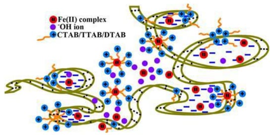Kinetic studies on the behavior of biologically relevant cations may also concern redox reactions. The reduction of Cr6+ to Cr3+ was examined in parallel with studies on the micellar effects on the lysis of organic systems [72,73]. Cr6+ is a known carcinogen, still present as a pollutant coming from industrial wastes. Its reduction occurs in the cell cytoplasm. The cited work [74] used micelles to mimic the cellular membranes as a model to gain information on the process occurring in the body. Spectrophotometric kinetic experiments were carried out by monitoring the decay of oxidant [Cr6+] at 415 nm at different time intervals. They discerned the details of the mechanism of the reduction reaction by 1-butanol in the presence of a cationic (n-cetyl pyridinium chloride, CPC), an anionic (sodium dodecylsulfate, SDS) or a neutral (TritonX-100) surfactant. In all cases, monomeric Cr6+ undergoes redox decomposition through two-electron transfer at the rate-determining step and a kinetic law of the first order on both reactants and the second order on the [H+] ion. The accelerating or decelerating effects of the surfactants were discussed on the basis of the partitioning of the reactants over different parts of the micellar phase (Gouy-Chapman or Stern layer).