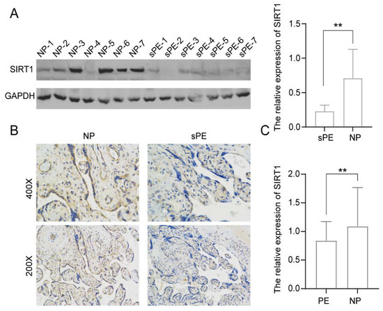To study the role of SIRT1 in PE, we evaluated the level of SIRT1 expression in human placental tissues from women with pre-eclampsia with severe features (sPE) (n = 7) and normal pregnant women (NP) (n = 7) (Figure 1). Compared with controls, the level of SIRT1 expression was significantly lower in the placentas of sPE patients (Figure 1A), as detected by Western Blotting. Immunohistochemistry results also showed that SIRT1 expression was apparently decreased in the placentas of sPE patients (Figure 1B).