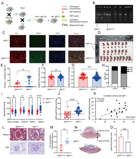 SIRT1+/− mice demonstrated pre-eclampsia-like symptoms. (A) Schematic diagram of SIRT1+/− mice construction. (B) Genotype of SIRT1+/− mice using PCR and agarose gel electrophoresis. (C) Immuofluorescence for SIRT1 in mice placental tissues from SIRT1flox/flox (n = 3) and SIRT1+/− (n = 7) mice. (D) Representative appearance of fetuses and placentas from SIRT1flox/flox and SIRT1+/− groups. (E–G) The embryo-resorption rate (E), the weight of the placenta (F), and the weight of the live fetus (G) in SIRT1flox/flox (n = 19) and SIRT1+/− (n = 31) mice. (H) The gene ratio of fetuses at E18.5 and P28 (E18.5: the 18.5th day of gestation, P28: the 28th day in postnatal age). (I) The systolic blood pressure (SBP) at basic condition, early PG (pregnancy), mid PG, late PG from SIRT1flox/flox (n = 20), and SIRT1+/− (n = 33) groups. (J) ΔBP (late PG—basic condition) in SIRT1flox/flox (n = 20) and SIRT1+/− (n = 33) groups. (K) The correlation of ΔBP and SIRT1 gene values in fetuses. (L) Masson staining and PAS staining of mice kidney tissues from SIRT1flox/flox (n = 3) and SIRT1+/− (n = 7) groups. (M) The concentration of urinary protein in SIRT1flox/flox (n = 6) and SIRT1+/− (n = 13) groups at late PG. (N) Masson staining of mice placental tissues in SIRT1flox/flox (n = 3) and SIRT1+/− (n = 7) groups. (O) The labyrinth/junctional zone ratio of each group. Error bars, mean ± SD. The data were analyzed by one-way ANOVA (and nonparametric or mixed) and unpaired Student’s test (and nonparametric tests). ** p < 0.01; *** p < 0.001; **** p < 0.0001, ns: no significance.