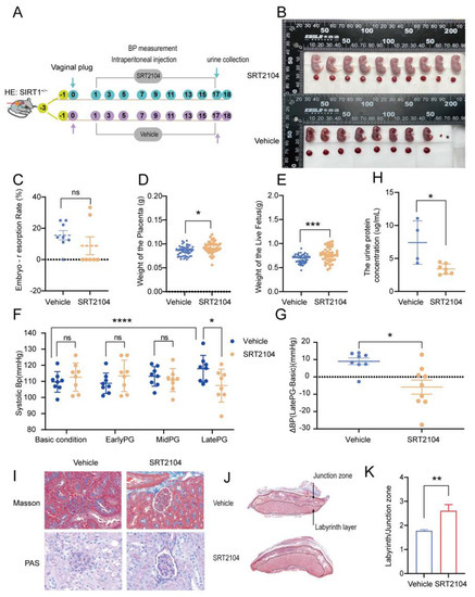 SRT2104 significantly improved the PE-like symptoms in SIRT1+/− mice. (A) Schematic diagram of the treatment of SIRT1+/− mice from early pregnancy to late pregnancy. (B) Representative appearance of fetuses and placentas from vehicle and SRT2104 groups. (C–G) The embryo-resorption rate (C), the weight of the placenta (D), and the weight of the live fetus (E) in vehicle (n = 8) and SRT2104 (n = 7) groups. (F) The SBP at basic condition, early PG, and mid PG, late PG from vehicle (n = 8) and SRT2104 (n = 9) groups. (G) ΔBP (late PG—basic condition) in vehicle (n = 8) and SRT2104 (n = 9) groups. (H) The concentration of urinary protein in vehicle (n = 4) and SRT2104 (n = 7) group at late PG. (I) Masson staining and PAS staining of mice kidney tissues from vehicle (n = 4) and SRT2104 (n = 4) groups. (J) Masson staining of mice placental tissues in vehicle (n = 4) and SRT2104 (n = 4) groups. (K) The labyrinth/junctional zone ratio of each group. Error bars, mean ± SD. The data were analyzed by one-way ANOVA (and nonparametric or mixed) and unpaired Student’s test (and nonparametric tests). * p < 0.05; ** p < 0.01; *** p < 0.001; **** p < 0.0001, ns: no significance.
