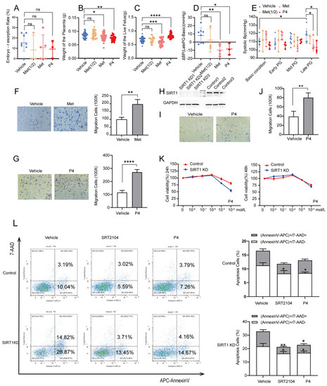 P4 could alleviate hypertension in SIRT1+/− mice and promote the invasion and inhibit the apoptosis of trophoblasts. (A–E) The embryo-resorption rate (A), the weight of the placenta (B), and the weight of the live fetus (C) in vehicle (n = 8), Met (1/2) (n = 3), Met (n = 5), and P4 (n = 3) groups. (D) ΔBP (late PG—basic condition) in vehicle (n = 8), Met (1/2) (n = 3), Met (n = 5), and P4 (n = 3) groups. (E) The SBP at basic condition, early PG, mid PG, late PG from vehicle (n = 8), Met (1/2) (n = 3), Met (n = 5), and P4 (n = 3) groups. (F,G) The invasion ability of Transwell assay in vehicle, Met (F), and P4 (G) groups of control group. (H) Western blot analysis of SIRT1 protein levels in trophoblasts of SIRT1 KD and control groups. (I) The invasion ability of Transwell assay of vehicle and P4 groups in SIRT1 KD trophoblasts. (J) Statistics of migrating cells. (K) The proliferation function checked by CCK8 at 24 h and 48 h treated with P4 (concentration: 0, 10−8, 10−7, 10−6, 10−5, 10−4 mol/L) in SIRT1 KD trophoblasts. (L) The apoptosis assay of vehicle, SRT2104 and P4 groups in SIRT1 KD trophoblasts. Error bars, mean ± SD. The data were analyzed by one-way ANOVA (and nonparametric or mixed) and unpaired Student’s test (and nonparametric tests). * p < 0.05; ** p < 0.01; *** p < 0.001; **** p < 0.0001, ns: no significance.