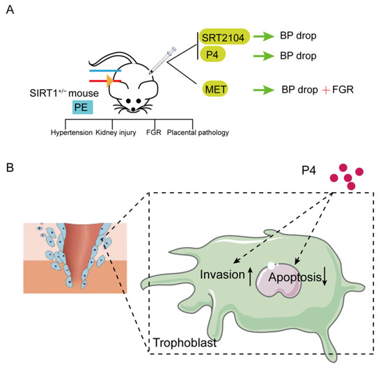 Summary diagram. (A)SIRT1 knockdown (SIRT1+/−) mice showed typical pre-eclampsia-like symptoms, such as hypertension, kidney injury, FGR, and placental pathology. These performances could be improved after intraperitoneal injection of SIRT1 agonist SRT2104 and P4. Metformin could also reduce the elevated blood pressure, but caused FGR. (B) Additionally, P4 could promote the invasion and inhibit the apoptosis of trophoblasts. (PE: pre-eclampsia; FGR: fetal growth restriction; P4: progesterone; Met: metformin.).