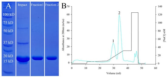 Purification of AfLEA1. (A) SDS-PAGE of crude samples obtained after affinity chromatography (IMPACT) or further purification using anion-exchange chromatography as a polishing step. Fractions 1 and 2 obtained during anion-exchange chromatography contain AfLEA1 at the expected molecular weight of ~19 kDa. (B) AfLEA1 binds to quaternary ammonium groups at a pH of 8.0 and elutes in two distinct fractions (blue line) at relatively low concentrations of NaCl (black line).