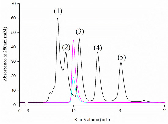 Size-exclusion chromatography of AfLEA1, both by anion-exchange chromatography, obtained fractions of the AfLEA1 (blue: peak fraction 1; magenta: peak fraction 2) elute from a size-exclusion column between ovalbumin (44 kDa) and carbonic anhydrase (29 kDa), respectively. Based on these data, the apparent molecular mass of AfLEA1 computes to 33.4 kDa, or approximately 75% larger than the calculated mass based on the polypeptide sequence of the protein. The black line shows the elution of molecular weight markers. The elution maxima correspond to: (1) conalbumin, 75 kDa; (2) ovalbumin, 44 kDa; (3) carbonic anhydrase, 29 kDa; (4) ribonuclease A, 13.7 kDa; and (5) aprotinin 6.5 kDa.