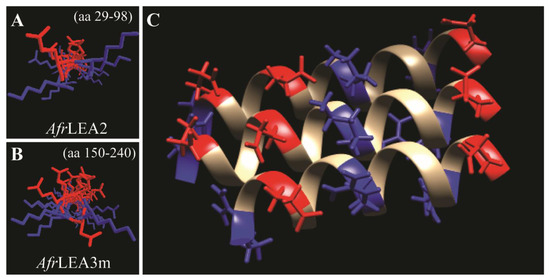 Although aromatic residues can interact with positively charged residues due to their delocalized π orbitals [42], the small number of aromatic residues does not appear to be sufficient to prevent the electrostatic repulsion of the α-helices in AfLEA1. Despite this source of instability, this structure is similar to a de novo-designed protein built to emulate armadillo repeat proteins (RCSB PDB ID: 5CWH), which has remarkably similar primary, secondary, and tertiary structures [43] to AfLEA1. Armadillo repeat proteins are highly stable and are commonly involved in cell signaling and misfolded protein degradation due to their promiscuous binding behaviors [44,45]. The structure of AfLEA1 appears to be stabilized by similarly charged stripes found on helices proposed for AfrLEA2 and AfrLEA3m [38]. The charge patterns are generated in these two LEA proteins from Group 3 through a specific arrangement of basic and acidic amino acids in the primary sequence (Figure 6A,B). If I-Tasser has accurately predicted the tertiary structure of AfLEA1, then charged stripes arise in this LEA protein from the tertiary association of alpha-helices, thereby stabilizing these helical clusters (Figure 6C) [17].