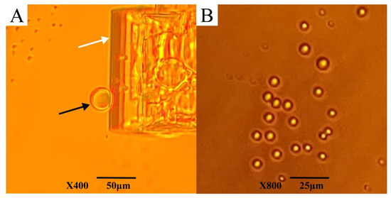 Although AfLEA1 appears to evenly distribute itself as an amorphous, glassy deposition during fast desiccation in pure water, as used for circular dichroism, it undergoes crystallization when dried more slowly for hours rather than minutes (Figure 7A). The formation of crystals indicates that AfLEA1 assumes a uniform structure in the desiccated state, as indicated by the circular dichroism data and structural predictions by I-Tasser. Unfortunately, scanning electron microscopy (SEM) reveals that the crystals formed by AfLEA1 during slow drying are of insufficient quality to employ X-ray crystallography to verify the structure of AfLEA1 in the desiccated state (Figure 7B). However, SEM also revealed spherical structures in the desiccated sample similar to those reported for the Group 6 LEA protein AfrLEA6, which is known to undergo LLPS in vitro during desiccation [21].