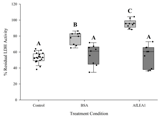 Residual activity of purified LDH was significantly increased when desiccated in the presence of BSA or AfLEA1 and then rehydrated with 100 mM sodium phosphate buffer at pH 6.5 (light gray box plots). LDH activity was not restored after desiccation in the absence of BSA or AfLEA1, and then rehydrated with 100 mM sodium phosphate buffer at pH 6.5 containing BSA or AfLEA1 (dark gray box plots). Control samples (white box plot) were desiccated and rehydrated in the absence of BSA or AfLEA1 (n = 9-18; ±SD, p < 0.05; different letters indicate significant differences between groups).