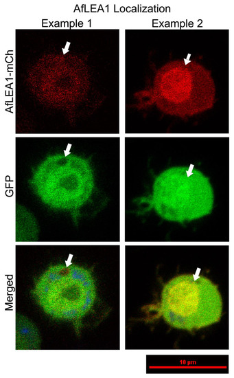 A chimeric protein composed of AfLEA1 and mCherry localizes predominately to the cytoplasm in D. melanogaster Kc167 cells ectopically co-expressing AfLEA1-mCherry and GFP (Examples 1 and 2). In some cells, AfLEA1-mCherry was also observed to undergo an LLPS and exclude GFP from the biomolecular condensate (Example 1). AfLEA1-mCherry was observed to accumulate in the nucleus of other cells (Example 2). Cells were stained with 200 µL of MitoView Blue, and AfLEA1-mCherry does not localize to the mitochondria. Images are representative images, and fluorescence intensities are not relative between examples (for a quantitative assessment, see Figure S3, Supplementary Materials).