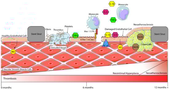During stent placement, the arterial wall is mechanically injured and denuded of its tunica intima, which is comprised of endothelial cells. This exposes the vascular smooth muscle cells (VSMCs) and extracellular matrix (ECM) of the tunica media to the stent surface and the circulating blood components. With fewer endothelial cells present, less NO and PGI2 is produced and secreted, causing a decrease in the anti-platelet activity of the remaining competent ECs [23]. In combination, these steps lead to the rapid deposition of platelets and fibrinogen (beginning of thrombosis) at the site of injury, which marks the beginning of vascular inflammation (see Figure 1) [24]. For patients with DM, the denudation of competent ECs can have a worsened effect due to the reduced bioavailability of NO in the presence of hyperglycaemia [12,25]. This state of endothelial dysfunction promotes the attachment of platelets and leukocytes to the stented region, contributing to the progression of vascular inflammation [12].