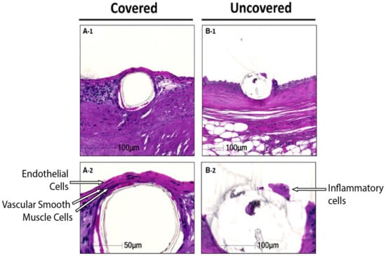 Covered and uncovered stent struts. (A-1), strut coverage with 2 layers of vascular smooth muscle cells and a monolayer of endothelial cells. (B-1), uncovered strut with coverage of inflammatory cells. (A-2,B-2) higher-powered images highlighting strut coverage (Adapted from [184]).