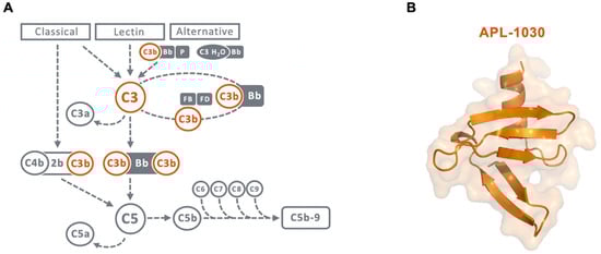 (A) Scheme of the complement cascade highlighting the central role of C3 and C3b in the amplification loop. Therapeutic targets for inhibition by APL-1030 are marked in orange. (B) Ribbon and surface representation of the 3D structure of APL-1030, with C-terminal alpha helix (top) and N-terminal end (bottom).