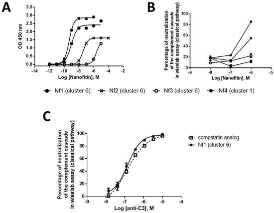 Nanofitin (in pAFG48) (A) binding dose–response relationship by ELISA (n = 1), (B) complement cascade inhibition by the Wieslab assay of classical pathway functional activity (n = 1), and (C) Nf1 complement cascade inhibition compared with a compstatin analog by the Wieslab assay (n = 1). ELISA, enzyme-linked immunosorbent assay; Nf, Nanofitin.