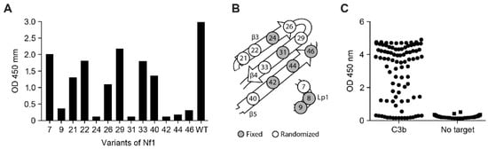 (A) Binding capacity on C3b of Nf1 alanine variants at 100 nM in ELISA (n = 1), (B) schematic Nf1 residues randomized for affinity maturation, and (C) ELISA screening of the variants of Nf1 resulting from the affinity maturation (n = 1). Nf, Nanofitin; OD, optical density.