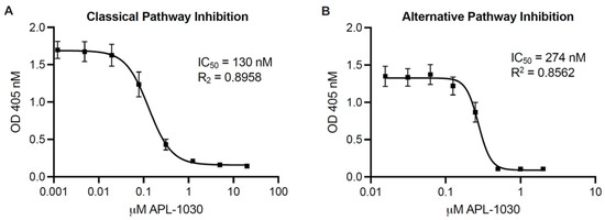 APL-1030 inhibits classical and alternative complement pathway activation. In vitro complement inhibition was assessed by the Wieslab assay for classical pathway activation (A) and alternative pathway activation (B). IC50, half-maximal inhibitory concentration; OD, optical density. Plots represent three independent experiments using 3threedifferent sources of serum from healthy human donors; error bars represent the SEM; lines represent nonlinear regression analysis.