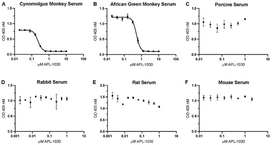 APL-1030 inhibits complement activation in sera from primate species (but not from non-primates). In vitro complement inhibition was assessed by the Wieslab assay for alternative pathway activation by lipopolysaccharides in (A) cynomolgus monkey, (B) African green monkey, (C) porcine, (D) rabbit, (E) rat, and (F) mouse sera. Of the species tested, only cynomolgus monkey (228.2 nM) and African green monkey (511.5 nM) showed measurable inhibition by APL-1030 in the Wieslab assay (A,B), while non-primate sera (C–F) showed no inhibitory activity up to 1 μM of APL-1030. All data points in duplicate. IC50, half-maximal inhibitory concentration; OD, optical density; error bars represent the SEM; lines (A,B) represent nonlinear regression analysis.