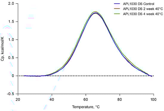 APL-1030 is stable for 1 month at 40 °C. Thermal stability of APL-1030 was assessed by differential scanning calorimetry at time 0, 2, and 4 weeks of constant exposure to 40 °C temperature. Cp, specific heat capacity; DS, differential scanning. N = 1 sample per test condition.