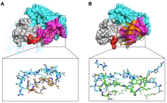 Comparison of the complex structures of compstatin with C3c, and APL-1030 with C3b. The complex structures of (A) compstatin, and (B) APL-1030, with C3c (PDB 2QKI) and C3b (PDB 7TV9), respectively, with a focus on their MG4 (grey, aa329–aa426) and MG5 (cyan, aa427–aa534) domains. Residues of C3c in interaction with the compstatin are labelled in magenta. A loop (aa370–aa374) subjected to a structural rearrangement between the two complex structures is labelled in red. A comparison of the protein/peptide hydrogen bonds of the binding interface of (A) C3c/compstatin with (B) is shown in detail.