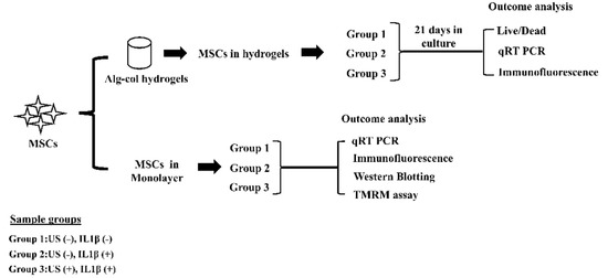 Experimental schematic. MSCs were seeded in alginate: collagen hydrogels or TCPs or coverslips, and divided into groups, as indicated. Group 1: cLIUS (−), IL1β (−); Group 2: IL1β (+), cLIUS (−); and Group 3: IL1β (+) cLIUS (+). Appropriate sample groups were treated with cytokine at a concentration of 10 ng/mL. cLIUS stimulation was applied as follows:14 kPa (5.0 MHz, 2.5 Vpp), and 10 or 20 min/application. Non-cytokine treated and non-cLIUS-stimulated samples served as controls. Upon completion of the study, samples were retrieved and subjected to the indicated outcome analyses.
