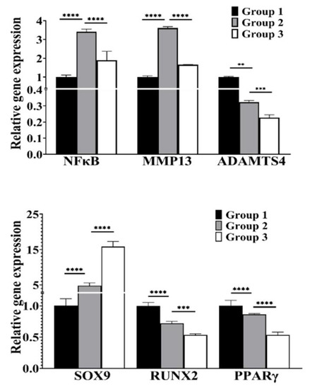 Gene expression analysis of MSCs in hydrogels. Cell homogenates (n = 10) were prepared from hydrogels; total RNA was extracted, and gene expression of lineage markers and catabolic markers was evaluated by qRT-PCR, and GAPDH was used as a housekeeping gene. Data are shown as the mean ± standard deviation of samples and p-value represents statistical significance (** p < 0.01; *** p < 0.001 and **** p < 0.0001).