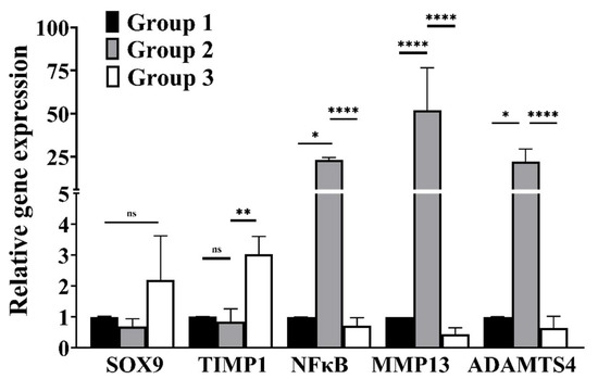 The gene expression levels of catabolic (MMP13, ADAMTS4), anabolic (TIMP1), and transcription markers (NFκB and SOX9) were evaluated by qRT-PCR and the results shown in Figure 4. In the presence of IL1β (group 2), the expression of catabolic genes and NFκB was significantly elevated, and the gene expression of SOX9 and TIMP1 were downregulated compared to controls (group 1). When IL1β-treated cells were further exposed to cLIUS, an abrogation in the expression levels of catabolic genes to basal levels, similar to group 1, was noted. However, in the same sample treatment (group 3), cLIUS yielded high gene expression levels of SOX9 and TIMP1. Independent experiments were also carried out in the presence of TNFα or IL6, and similar trends were noted and presented in Supplementary Figure S3. Cumulative results demonstrated that cLIUS promotes the gene expression of anabolic markers in the presence of proinflammatory cytokines by downregulating catabolic genes MMP13, ADAMTS4, and NFκB.
