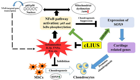Schematic representation of the cLIUS-induced chondroprotective mechanisms. cLIUS promoted MSC chondrogenesis by inhibiting the cytokine-induced activation of the NFκB signaling pathway by engaging the tIκBα feedback mechanism while upregulating the expression of SOX9, the collagen II transcription factor. It is also posited that cLIUS acts to preserve the mitochondrial potential, which is impacted by cytokines.