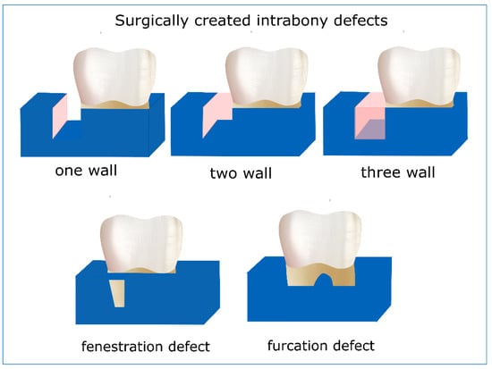 The included in vivo studies employed the intrabony/furcation periodontal defect model or the fenestration periodontal defect mode (Figure 2) as an orthotopic model and different ectopic models to test the regenerative capacity of tissue engineering constructs consisting of scaffolds, matrices, membranes, hydrogels etc., either loaded with growth factors or seeded with different cells/cell sheets.