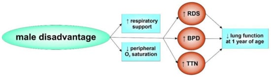 Apart from RDS, other respiratory diseases are also more common in boys than in girls. Several studies suggest that premature male infants are more prone to the development of bronchopulmonary dysplasia (BPD), a chronic lung disease of prematurity [,,,]. In this regard, male sex has been shown to be an independent predictor for the development of BPD [,]. In a large European cohort of preterm infants with a gestational age below 32 weeks, male sex was a major risk factor for BPD development compared with females [], confirming previous reports from the Vermont Oxford Network []. Furthermore, transient tachypnea of the newborn (TTN) occurs in about 1 out of 100 term neonates. The rate of TTN substantially increases with the growing number of caesarean sections, often performed without preceding labor, raising the relevance of TTN during the past decade []. Delayed resorption of fetal lung fluid constitutes the major pathophysiological factor of TTN []. Several studies identified male sex as a significant risk factor for TTN development [,,,]. Female infants were shown to achieve higher peripheral oxygen saturation earlier than males, further confirming a “male disadvantage”. At 4 min after birth, more than 50% of female infants had a peripheral oxygen saturation ≥90%, while only 3% of male infants achieved this saturation []. In accordance, lower flows in boys were observed in lung function studies in full-term infants [,,]. Moreover, flows were up to 30% lower in preterm males compared with females, a greater effect than in full-term infants [,]. Thus, the “male disadvantage” in respiratory distress is heightened by prematurity []. In a twin pregnancy, the respiratory and neurological outcome was enhanced when the fetus (male or female) shared the womb with a female co-twin [].