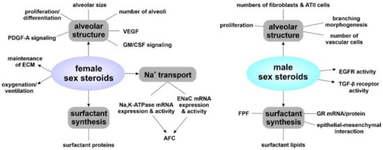 Impact of female and male sex steroids during fetal lung development. A relationship between male and female sex steroids and the developing alveolar structure as well as surfactant synthesis has been reported. In contrast, Na+ transport was affected only by female sex steroids.