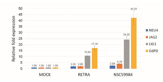 p73 activator(s) activate p73 downstream genes in OCEM-1 cells. RETRA (40 μM) or NSC59984 (100 μM) could upregulate p73 downstream genes NEU4, JAG2, LIG1 and G6PD in OECM-1 cells. Mock (DMSO only) was calculated as 1 to normalize for other conditions.