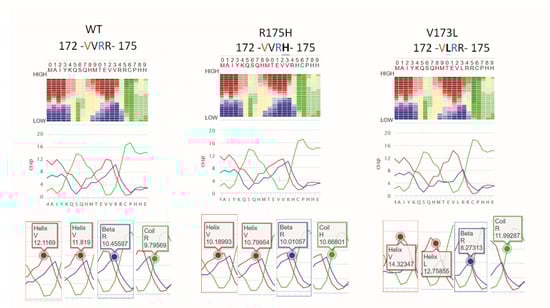 The CSSP value of the β-strand of flanking amino acids (a.a.) on p53 V173L is lower than the wild-type (WT) and R175H. The propensity for each of the three secondary structure elements, α helix (red), β-strand (blue) and coil (green), is calculated at 20 different levels, so the sum of the CSSP scores is 20. R175H flanking a.a. reduces α-strand CSSP from 12.1169 (WT) to 10.18993. V173L flanking a.a. reduces β-strand CSSP from 10.45597 (WT) to 8.27313. V173L flanking a.a. has a 14.32347 α-strand CSSP larger than WT (12.1169) and R175H (10.18993).