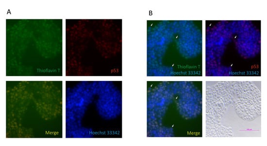 p53 is colocalized with thioflavin T in Detroit 562 cells. (A) p53 was used to stain for protein aggregation and is shown in red; thioflavin T was used to stain for protein aggregation and is shown in green; Hoechst 33342 was used to stain for nuclear counterstains and is shown in blue. p53 signals are shown to have the same location as the thioflavin T signals in the merged figure. (B) The merged figure shows that there are some cells with cytosolic thioflavin T/p53 signals (arrows).