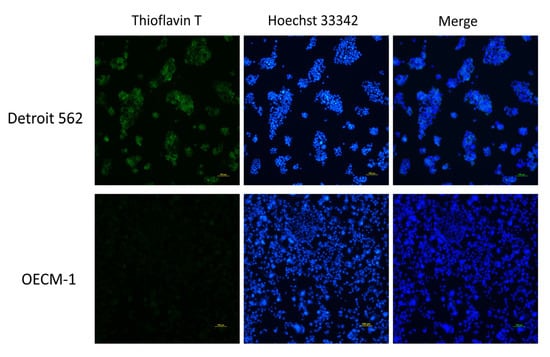 Protein aggregation in HNSCC cell lines. Thioflavin T was used to stain for protein aggregation and is shown in green; Hoechst 33342 was used to stain for nuclear counterstains and is shown in blue. Detroit 562 cells showed more thioflavin T signals than OECM1 cells.