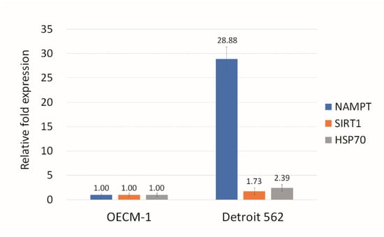 NAMPT has a higher level of expression in Detroit 562 cells than in OECM-1 cells. Although the levels of NAMPT, SIRT1, and HSP70 expression in Detroit 562 were larger than in OECM-1, the NAMPT expression showed, by far, the greatest difference between the two cell lines. Gene expression in OECM1 cells was calculated as 1.