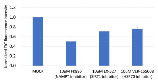 NAMPT inhibitor was able to repress protein aggregation signals. Although all the inhibitors tested (NAMPT, SIRT1 and HSP70) reduced the aggregation signals in Detroit 562, the NAMPT inhibitor had the most pronounced effect in reducing the protein aggregation. The protein aggregation signal was calculated as the OD ratio of ThT/Hoechst 33342 as normalized ThT fluorescence intensity. Mock was calculated as 1 to normalize for other conditions.
