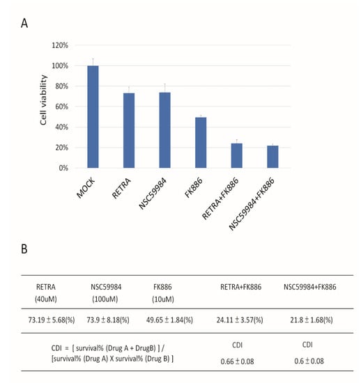 Synergistic repression of Detroit 562 cell growth mediated by p73 activators and NAMPT inhibitors. (A) RETRA, NSC59984 and NAMPT inhibitor (FK886) can inhibit Detroit 562 growth. Mock was calculated as 1 to normalize for other conditions. (B) The coefficient of drug interaction (CDI) was calculated as (A + B)/A×B. CDI < 1 = 1 or >1 indicates that the drugs are synergistic, additive or antagonistic, respectively. CDI < 0.7 indicates that the drug is significantly synergistic. p73 activator (RETRA) and NAMPT inhibitor (FK886) act synergistically (CDI = 0.66) to repress cell proliferation in Detroit 562 cells. Another p73 activator (NSC59984) and NAMPT inhibitor (FK886) also have synergic effects (CDI = 0.6) that reduce cell growth.