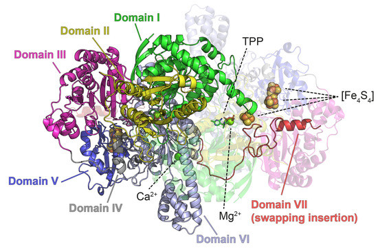 Crystal structure of PFOR (PDB code: 1B0P). The seven structural domains are colored differently as previously defined [26]: Domain I (residues 1–258), green; Domain II (residues 259–415), yellow; Domain III (residues 416–627), pink; Domain IV (residues 628–668), gray; Domain V (residues 669–785), blue; Domain VI (residues 786–1170), light blue; Domain VII (residues 1171–1232), red. TPP molecules are displayed in sticks; [Fe4S4], Mg2+ and Ca2+ are displayed with spheres. One of the monomers is displayed as a transparent image.