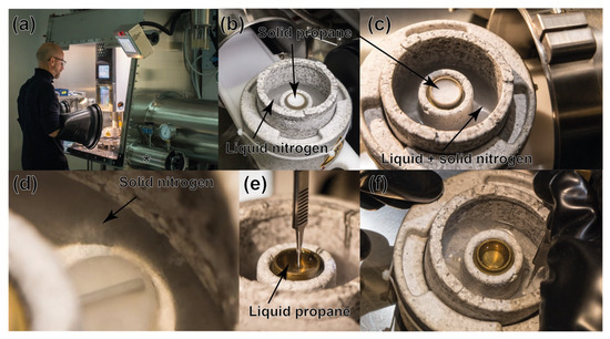 Cryo-EM grid preparation under anaerobic conditions. (a) View of the glovebox with the Vitrobot system inside. The symbol * shows the small airlock used to introduce the cryo-EM grids’ freezing Dewar. (b) View of the Dewar with its liquid nitrogen-filled pot and cup with solid propane, before its introduction to the airlock; and (c) treatment under vacuum inside the airlock causes the solidification of the nitrogen bath. (d) Close view of the pot with solid nitrogen (black arrow). (e,f) View of the brass cup with liquid propane where the cryo-EM grids will be immersed.