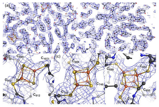 The reconstructed cryo-EM density map was of good-enough quality to fit almost all of the protein residues (Figure 5a). As expected, less well-defined regions are found at protein surface loops. The largest disordered region corresponds to the first 14 residues of domain VII (residues 1170–1183), which consists of a domain-swapping extension (Figure S7). In addition, the Cys1195-Cys1212 disulfide bridge [47], the Ca2+ and Mg2+ ions and the thiamine pyrophosphate (TPP), essential for the protein activity, are clearly visible in the cryo-EM reconstruction (Figure S8). Their stereochemistry and coordination are similar to that of the corresponding crystal structure (Figure S9d). More to the point, the three [Fe4S4] clusters are also perfectly defined in each monomer with high matching density (up to about 15 σ) (Figure 5b–d). The four iron and four sulfide atoms are observed in all clusters, and all of the metal ions are bound to their expected cysteine ligands. The stereochemistry is canonical and agrees well with the one observed in crystal structures (Figure S9a–c). Only one of the cysteine ligands of the distal [Fe4S4] cluster displays an alternative conformation never seen in the published X-ray structures (Figure S8e). All of the other cysteine ligands have the same stereochemistry as the previously published structures (Figure S9).
